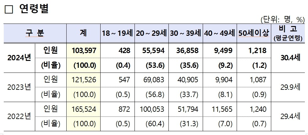지원자의 평균 연령은 30.4세이며, 연령대별로는 20대 이하가 54.0%로 가장 많고 30대 35.6%, 40대 9.2% 순이었다. 50세 이상은 1,218명이 지원해 1.2%로 가장 낮은 수치를 보였다.