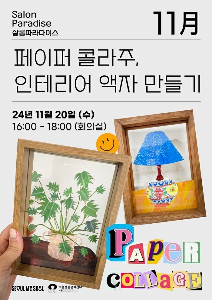 서울생활문화센터 낙원은 11월 20일(수) ‘페이퍼 콜라주, 인테리어 액자 만들기’ 클래스를 진행한다. 다양한 미술 기법을 배울 수 있는 해당 클래스는 11월 8일(금)부터 선착순으로 참여자를 모집한다.