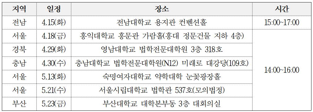 ▲법학적성시험 전국순회 설명회 장소 및 일정 |