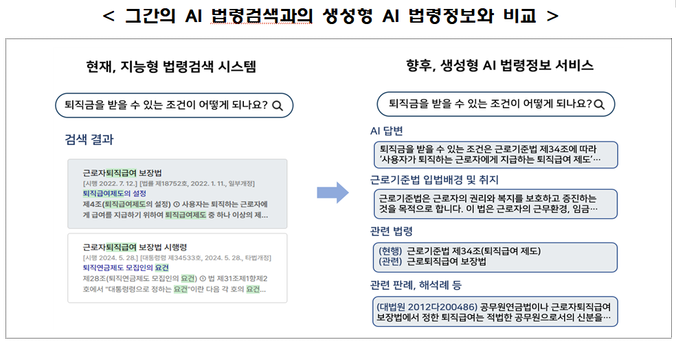법제처는 국민이 일상에서 법률을 쉽고 빠르게 이해할 수 있도록, 국가법령정보센터에 생성형 AI 기술을 접목한다. 기존 지능형 검색이 단순히 법조문을 찾는 수준이었다면, 앞으로는 입법 취지와 배경, 관련 판례·해석례까지 AI가 종합적으로 설명하는 맞춤형 서비스가 제공된다.
