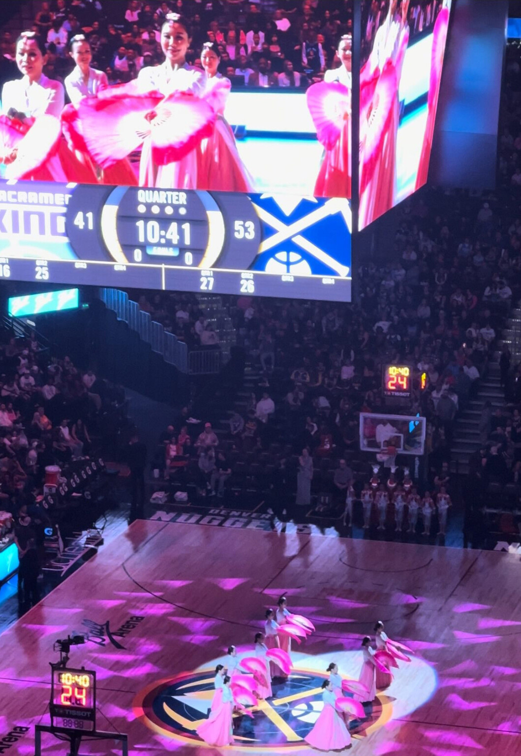 <올해 초 미국 NBA 덴버 너게츠 홈 구장에서 '중국 댄스팀'이라고 소개하며 중국인들이 한복을 입고 부채춤을 추는 모습>