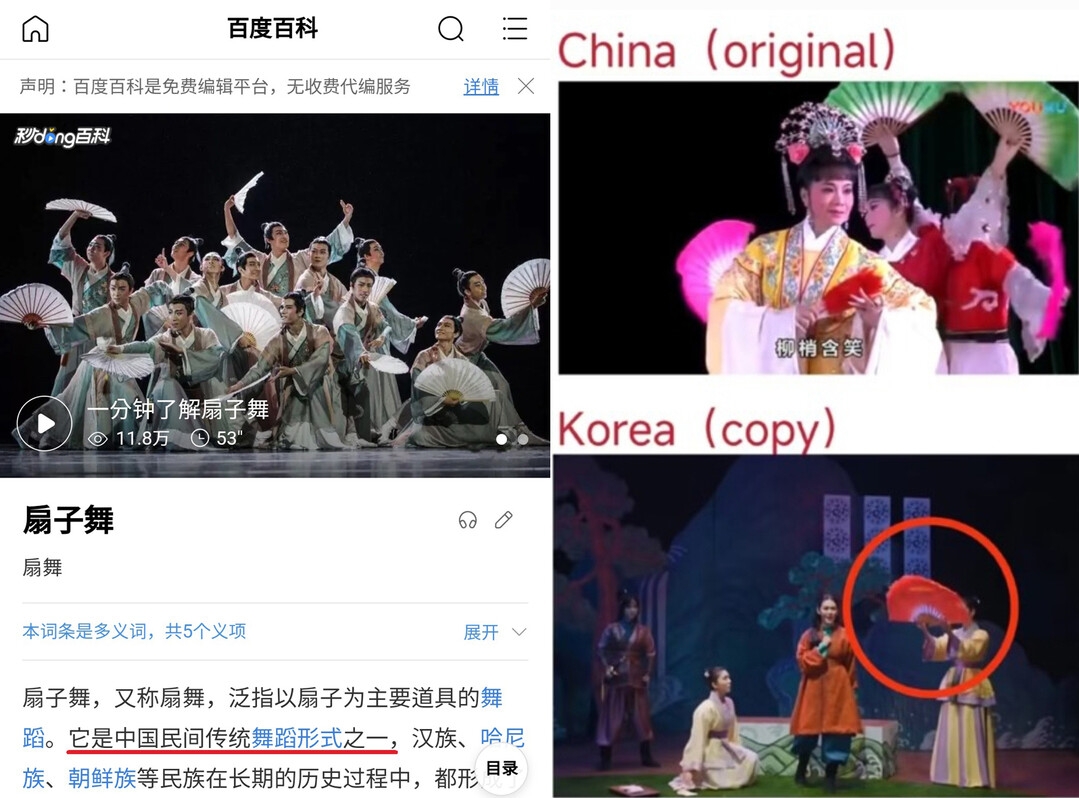 <바이두 백과사전에서 부채춤을 '중국 민간 전통무용'으로 소개(좌측, 빨간 밑줄)와 중국 SNS 상에서 퍼지고 있는 '부채춤 한국 카피' 파일(우측)>