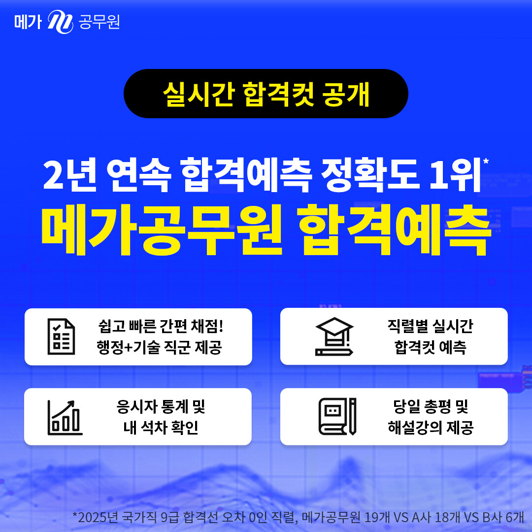 공무원 시험 전문 브랜드 ‘메가공무원’이 오는 21일 2025 지방직 9급 공무원 필기시험 응시생을 대상으로 높은 정확도의 합격예측 풀서비스를 제공한다고 밝혔다.