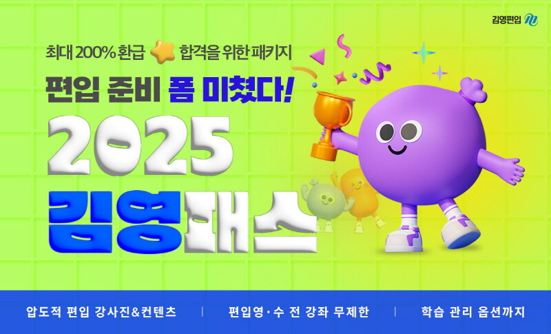 2025 김영패스는 구매일로부터 2025년 1월 31일까지 무제한 반복 수강할 수 있는 프리패스 편입 인강 상품으로, 편입 영어&수학 전 영역·단계·강의를 자율 수강할 수 있다. 편입 최종 합격 시 수강료 최대 200% 환급 혜택이 포함돼 있으며, 30일까지 얼리버드 한정 20만 원 즉시 지원 혜택을 지원하고 있다.