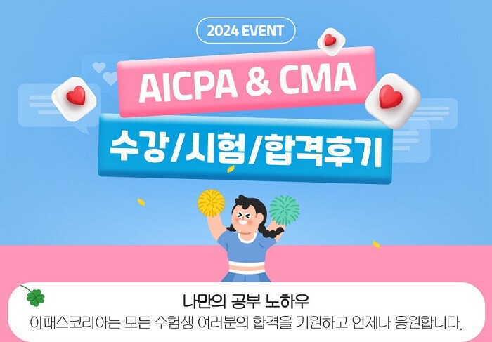 후기 작성은 홈페이지 로그인 후 AICPA 및 CMA 시험/합격후기 게시판에서 글쓰기 등록이 가능하며 이외 진행 중인 다양한 이벤트 소식은 이패스코리아 이벤트 페이지에서 확인할 수 있다.