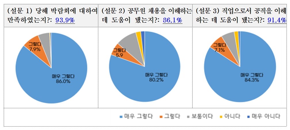 이번 박람회는 누적 방문자 수가 1만 3,000여 명을 넘어섰으며, 방문자들에게 물었더니 행사에 대한 만족도가 93.9%로 역대 최고 실적을 기록했다. 또한 응답자 91,4%는 공직에 대한 이해도가 높아졌다며 큰 호응을 받았다.