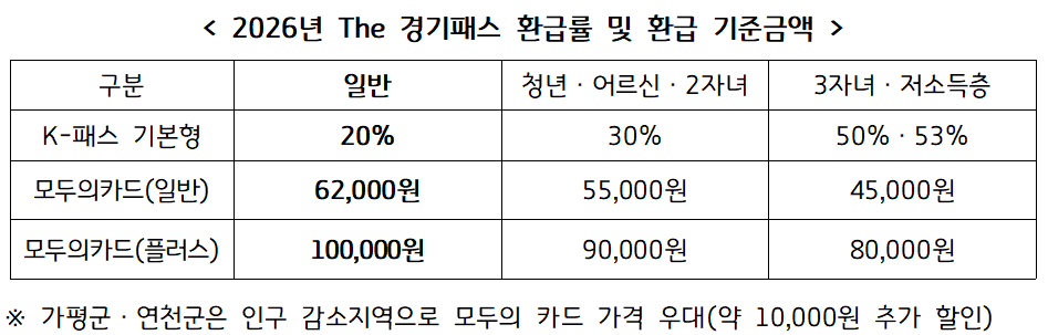 경기도는 2026년 1월부터 국토교통부 K-패스에 정액권 기능을 더한 ‘모두의 카드’가 신설됨에 따라, K-패스를 기반으로 운영 중인 The 경기패스 역시 개편해 월 일정 금액을 넘겨 이용하면 초과분을 전액 돌려주는 무제한 환급 방식으로 전환한다고 밝혔다.