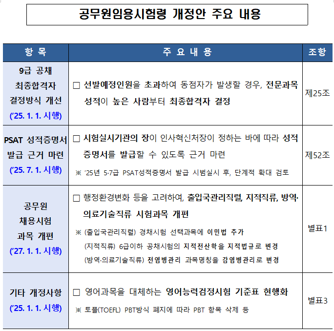 [피앤피뉴스=마성배 기자] 내년부터 9급 국가공무원 공채시험에서 동점자 발생 시 직무 전문성과 관련된 과목 성적이 최종합격자를 가리게 된다. 또한, 공직적격성평가(PSAT) 성적증명서 발급이 가능해지고, 일부 직류 시험 과목도 변경된다. 인사혁신처(처장 연원정)는 이러한 내용을 담은 ‘공무원임용시험령’ 개정안이 3일 국무회의를 통과했다고 밝혔다.