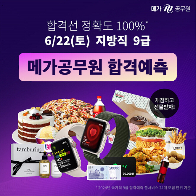 이와 더불어 메가공무원 합격예측 풀서비스는 9급공무원지방직 필기시험에 응시한 수험생들을 대상으로 푸짐한 경품을 증정하는 이벤트도 함께 진행한다.