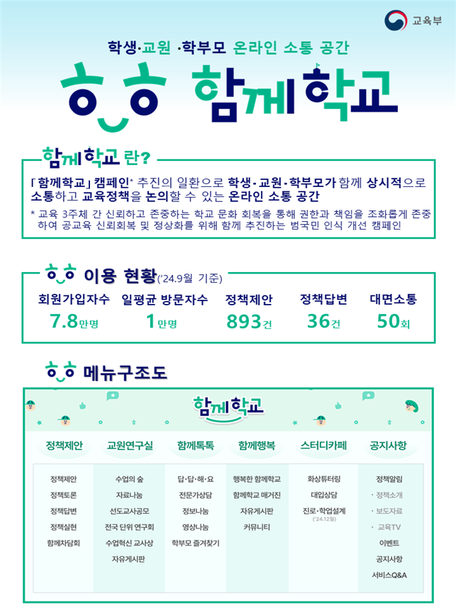 또한, 교육부는 ‘함께학교’ 플랫폼을 통해 국민 누구나 교육정책에 대한 의견을 제시할 수 있도록 하고 있으며, 우수 제안자들은 차담회에 직접 초청되는 방식으로 현장과의 소통을 강화하고 있다.