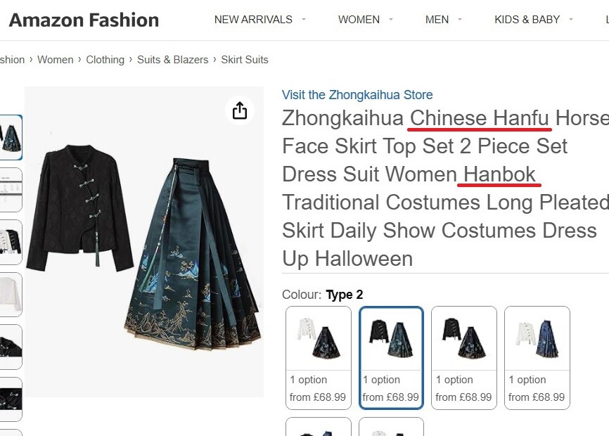 [피앤피뉴스=마성배 기자] 전 세계 누리꾼들이 대거 이용하는 글로벌 전자상거래 플랫폼 아마존에서 중국 전통의상인 ‘한푸’를 한국의 전통 의상 ‘한복’으로 표기해 판매하는 사례가 다수 발견되며 논란이 확산되고 있다.