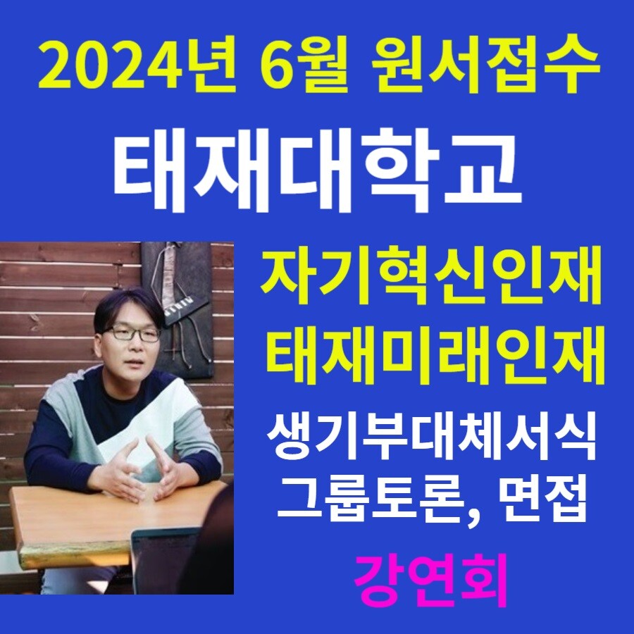 한국형 미네르바대학인 태재대학의 2024년 입시 일정은 6월 3일~ 6월 12일 원서접수와 생기부대체서식 및 자기성과입증자료, 자기소개 에세이 서류제출을 시작으로 6월 15일 온라인을 통한 태재인재 기초소양설문작성, 2024년 7월 17일 ~20일 자기혁신인재전형 자기혁신성과 발표 제출 및 7월 27일 치러지는 개별심층면접과 7월 28일 태재미래인재전형 그룹토론 면접으로 진행된다.
