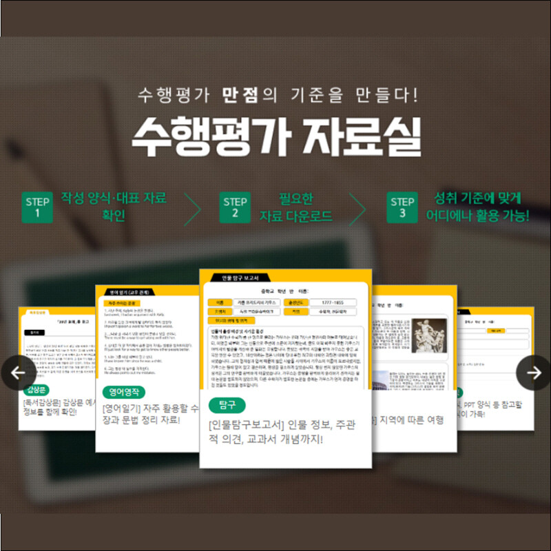 오늘 당장 독서감상문을 작성해야 하거나 영어 일기를 써야 하는 경우라도 걱정할 필요가 없다. 1등 교과서 개발진이 함께하는 밀크T의 수행평가 자료실에서는 나에게 필요한 수행평가 예시 답안 및 각종 보고서 양식의 다운로드가 가능하다.