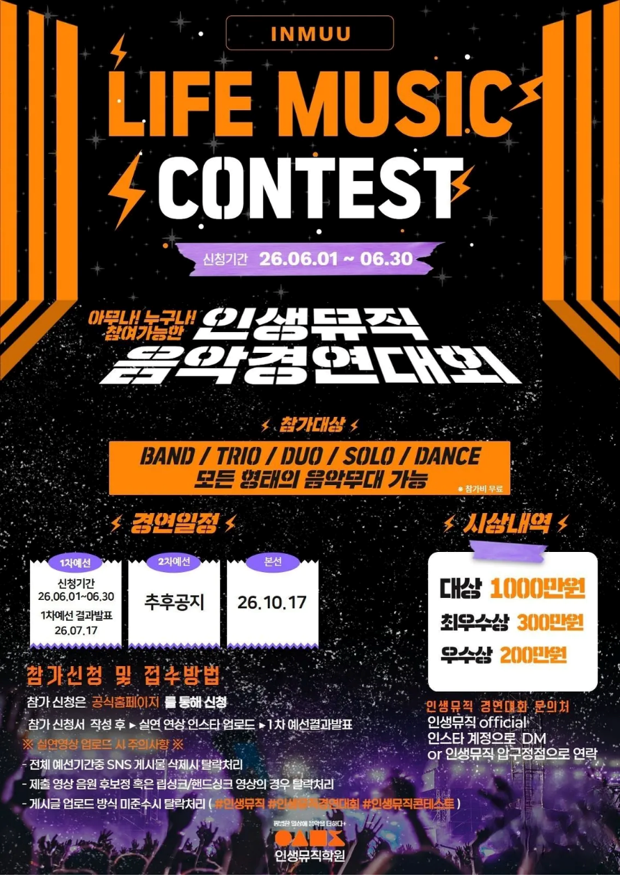 실용음악 교육 브랜드 인생뮤직이 총상금 1,500만 원 규모의 전국 실용음악 경연대회를 개최한다. 이번 대회는 인생뮤직 본사가 주최하며, 노래·밴드·기악·댄스 등 장르 제한 없이 누구나 참가할 수 있도록 구성됐다. 예선은 온라인 영상 심사 방식으로 진행되고, 본선은 2026년 10월 17일 오프라인 무대에서 열린다.
