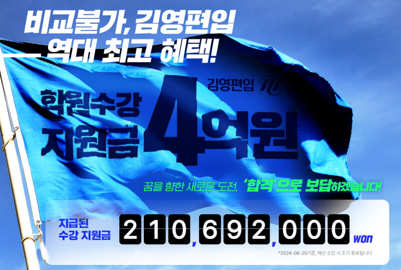 [피앤피뉴스=마성배 기자] 메가스터디교육 대학편입 대표 브랜드 (주)아이비김영 ‘김영편입’이 ‘학원 수강 지원금 4억 원 프로모션’을 진행한다고 밝혔다.