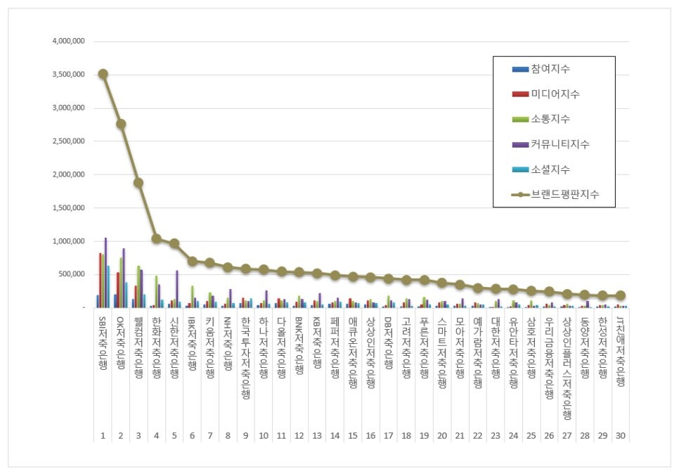 5위, 신한저축은행 브랜드는 참여지수 67,202 미디어지수 110,292 소통지수 133,661 커뮤니티지수 565,934 소셜지수 93,522가 되면서 브랜드평판지수 970,610으로 분석됐다. 지난 6월 브랜드평판지수 1,078,949와 비교해보면 10.04% 하락했다.
