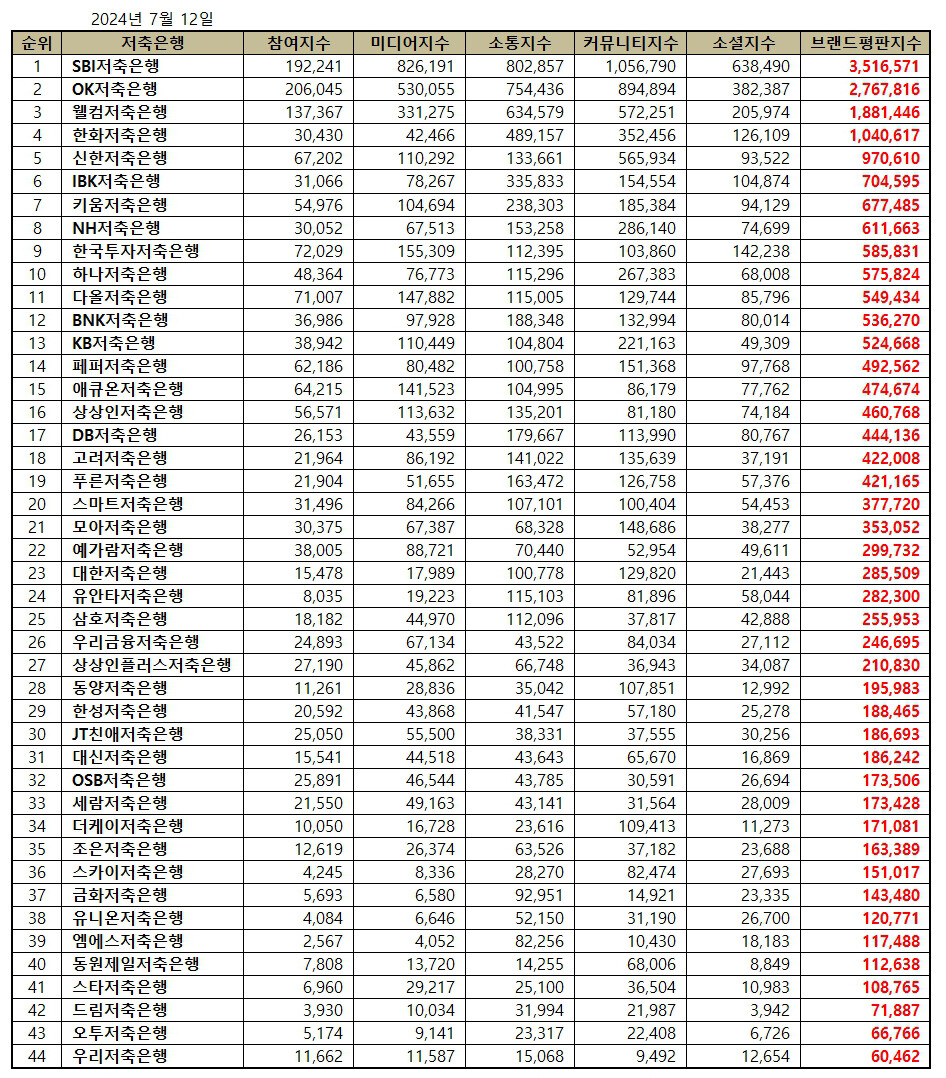 저축은행 브랜드평판 2024년 7월 빅데이터 분석결과, 1위 SBI저축은행 2위 OK저축은행 3위 웰컴저축은행으로 분석됐다.