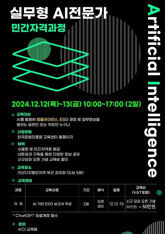 [피앤피뉴스=서광석 기자] 한국준법진흥원(원장 이정명)이 '실무형 AI 전문가 민간자격과정' 정규 과정을 개설하였다. 교육은 오는 12월 12일(목)부터 13일(금)까지 이틀간 진행되며, 본 과정을 이수한 참가자는 '실무형 AI 전문가' 민간자격증을 취득할 수 있다.