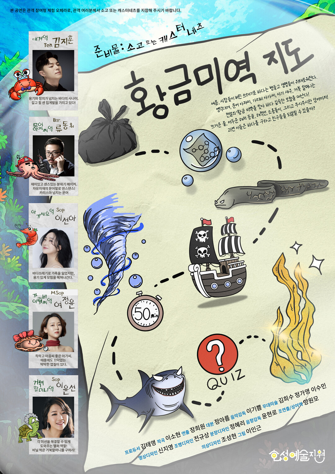 출연진에는 테너 김지훈(대게 역), 바리톤 류동휘(문어아저씨 역), 소프라노 이선아(아기새우 역), 메조소프라노 여정윤(가리비아가씨 역), 소프라노 이윤선(거북이할머니 역) 등 실력파 성악가들이 참여해 생동감 있는 무대를 꾸민다.