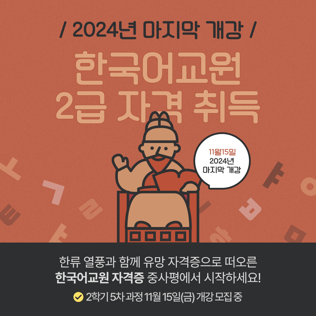 국가평생교육진흥원 평가인정 교육훈련기관인 중앙사이버평생교육원에서는 2024년도 마지막 개강 일정으로 한국어교원 2급 자격증 취득 과정을 모집 중에 있다. 개강일은 11월 15일(금)이며, 수강신청은 개강일 하루 전인 11월 14일(목)까지 가능하다.