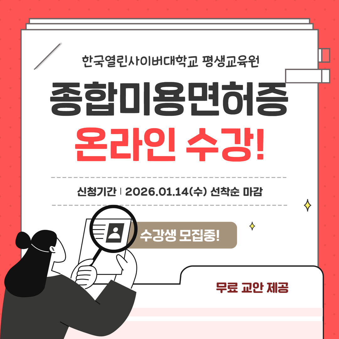 한편, 한국열린사이버대학교 평생교육원 종합미용면허증 과정은 1월 14일(수)까지 모집하며, 1월 15일(목) 개강 예정이다. 자세한 사항은 공식 홈페이지를 통해 확인할 수 있다.