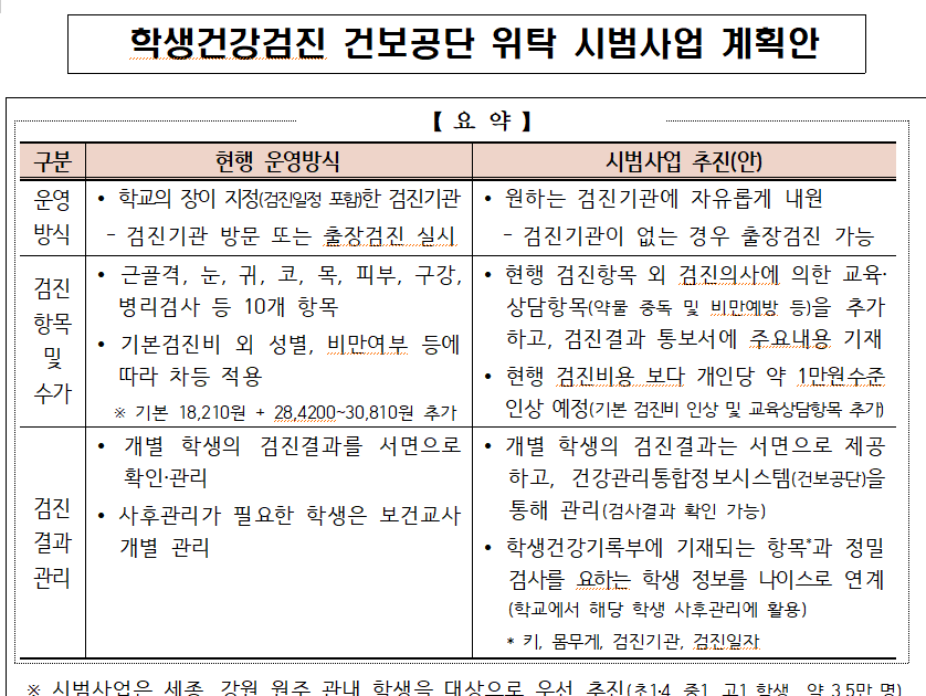 올해 하반기 중 세종 및 강원 원주 관내 196교, 약 3만 5천명을 대상으로 학생건강검진 개선 방안을 시범 운영하고, 시범사업 결과를 토대로 모든 학교로의 전면 확대 시기를 검토할 방침이다.