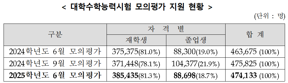 이번 모의평가에 지원한 수험생은 총 474,133명으로, 재학생 385,435명과 졸업생 등 수험생 88,698명으로 구성됐다. 이는 작년 6월 모의평가 대비 10,458명 증가한 수치로, 재학생은 10,060명, 졸업생 등 수험생은 398명 늘어났다.