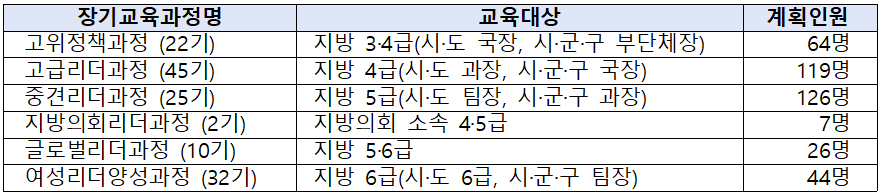 자치인재원이 운영하는 장기교육과정은 ▲고위정책과정 ▲고급리더과정 ▲중견리더과정 ▲지방의회리더과정 ▲글로벌리더과정 ▲여성리더양성과정 등 총 6개 과정으로 구성된다.