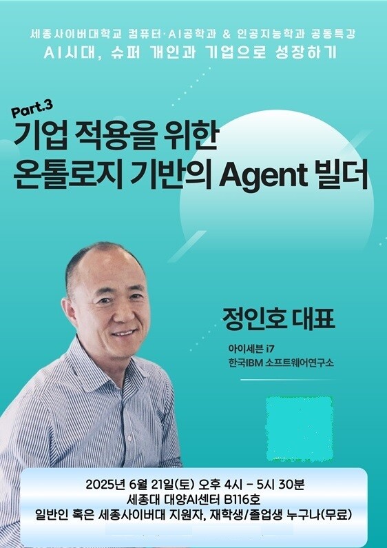 세종사이버대학교(총장 신구) 인공지능학과가 오는 21일 오후 4시 정인호 대표(i7, 아이세븐)를 초청해 ‘기업 적용을 위한 온톨로지 기반의 에이전트(Agent) 빌더’ 특강을 개최한다고 16일 밝혔다.