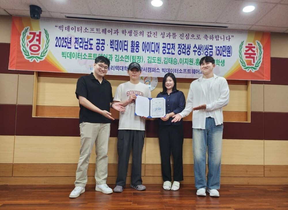 한국폴리텍대학 서울강서캠퍼스(학장 황금주) 빅데이터소프트웨어과 2학년 재학생 팀이 전라남도와 (재)전남정보문화산업진흥원이 주최‧주관한 「2025년 전라남도 공공·빅데이터 활용 아이디어 공모전」에서 제품·서비스 개발 부문 장려상을 받았다. 학생들은 공공데이터를 실제 서비스로 구현해 소프트웨어 개발 역량과 완성도를 인정받았다.