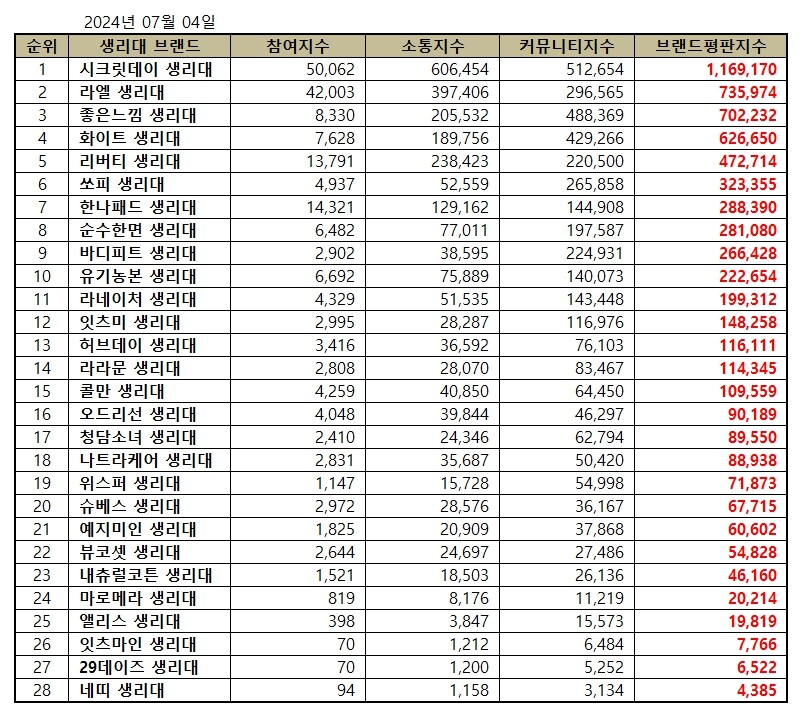 2024년 7월 생리대 브랜드평판 순위는 시크릿데이, 라엘, 좋은느낌, 화이트, 리버티, 쏘피, 한나패드, 순수한면, 바디피트, 유기농본, 라네이처, 잇츠미, 허브데이, 라라문, 콜만, 오드리선, 청담소녀, 나트라케어, 위스퍼, 슈베스, 예지미인, 뷰코셋, 내츄럴코튼, 마로메라, 앨리스, 잇츠마인, 29데이즈, 네띠 생리대 순으로 분석됐다.