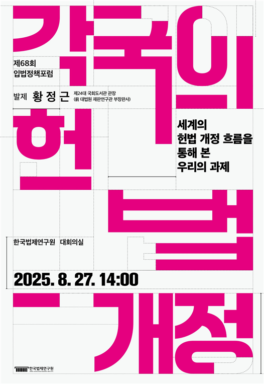 [피앤피뉴스=마성배 기자] 한국법제연구원(원장 한영수)이 오는 27일 오후 2시 세종 소재 연구원 대회의실에서 제68회 입법정책포럼을 연다. 이번 포럼은 ‘세계의 헌법 개정 흐름을 통해 본 우리의 과제’를 주제로 황정근 국회도서관장을 발제자로 초청해 진행된다.