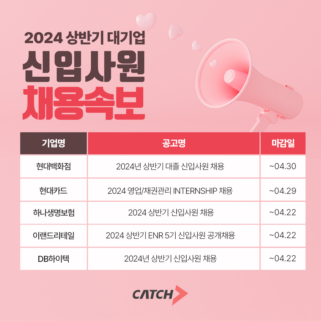 [피앤피뉴스=서광석 기자] 18일 진학사 캐치는 현대백화점, 현대카드, 하나생명보험, 이랜드리테일, DB하이텍 등 대기업 신입사원 채용 속보 소식을 전했다.