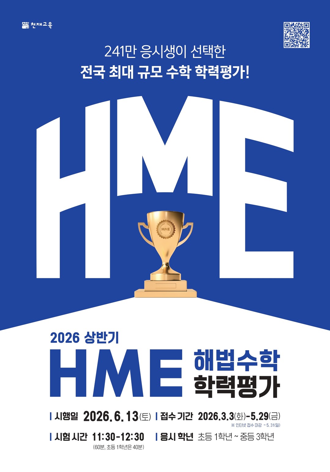 천재교육은 초·중등 학생을 대상으로 ‘2026 HME 해법수학 학력평가’를 실시한다고 밝혔다. 시험은 6월 13일 진행되며, 초등학교 1학년부터 중학교 3학년까지 응시할 수 있다.