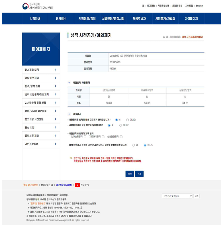 자세한 사항은 사이버국가고시센터(www.gosi.kr)에 접속해 ‘성적 사전공개/이의제기’ 메뉴에서 확인할 수 있으며, 시스템 관련 문의는 콜센터(1800-6634), 성적 관련 문의는 인사혁신처 경력채용과(044-201-(5급)8245 / (7급)8376)로 가능하다.