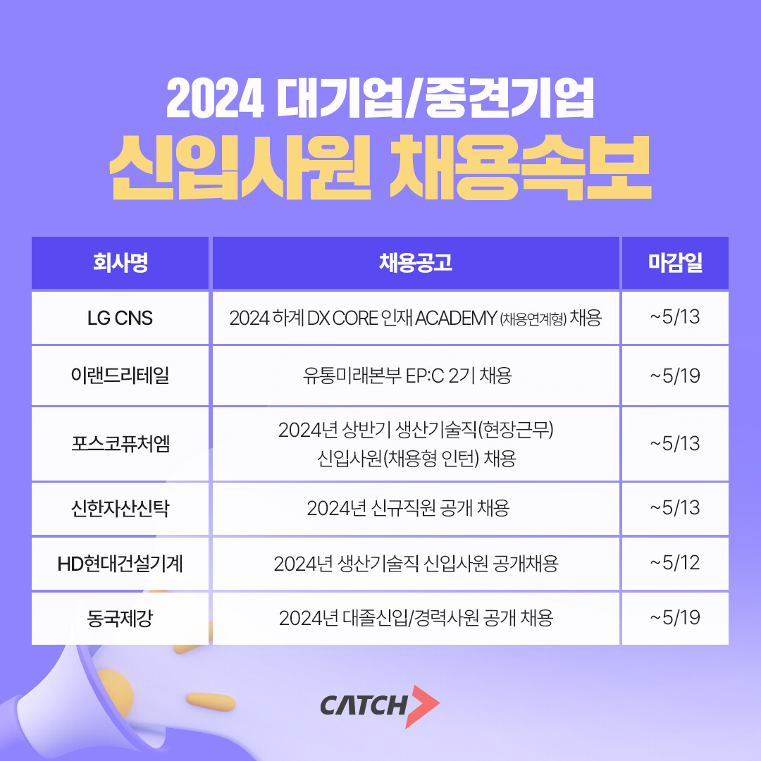[피앤피뉴스=마성배 기자] 진학사 캐치(www.catch.co.kr)가 올 상반기 LG CNS, 이랜드리테일, 포스코퓨처엠, 신한자산신탁, HD현대건설기계, 동국제강 등 주요 대기업 및 중견기업에서 신입·인턴 채용이 활발하게 진행되고 있다고 2일 밝혔다.
