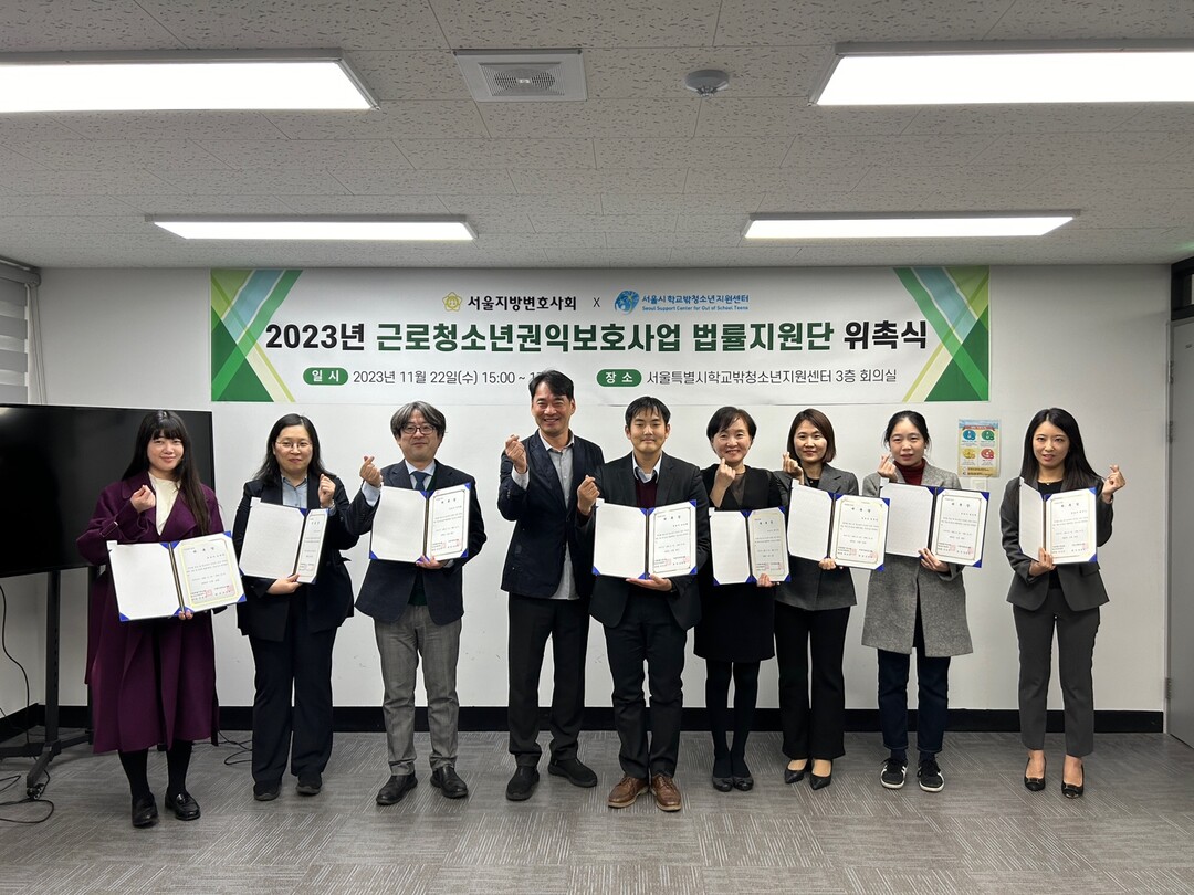 이날 위촉식에는 서울특별시학교밖청소년지원센터, 서울지방변호사회 사회공헌팀, ‘학교 밖 청소년 법률지원단’ 변호사 등 총 20명이 참석했다.