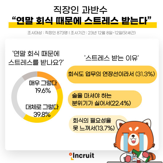 인크루트(대표 서미영)가 12월 8일부터 12일까지 직장인 873명에게 ‘연말 모임과 회식, 가기 싫은가요?’라고 설문을 진행했다.