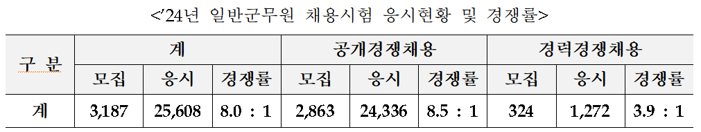 공개경쟁채용의 경우 2,863명 선발에 24,336명이 지원하여 8.5대 1의 평균 경쟁률을 보였고, 경력경쟁채용은 324명 선발에 1,272명이 지원하여 평균 3.9대 1의 경쟁률을 기록했다.