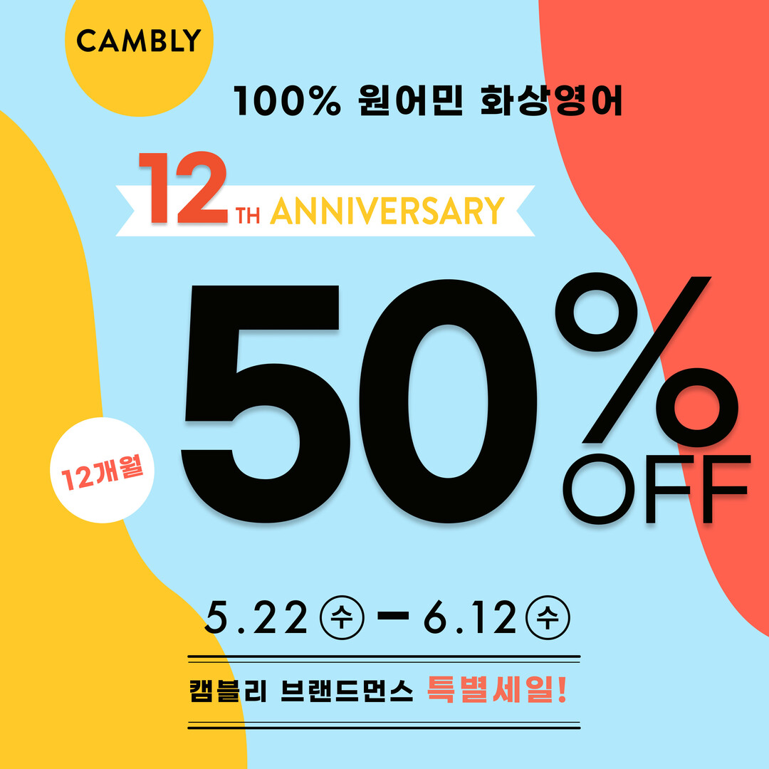 글로벌 원어민 화상영어 캠블리(CAMBLY)가 12주년을 기념하여 50%를 할인하는 브랜드먼스(Brand Month) 프로모션을 오는 6월 12일(수)까지 진행한다