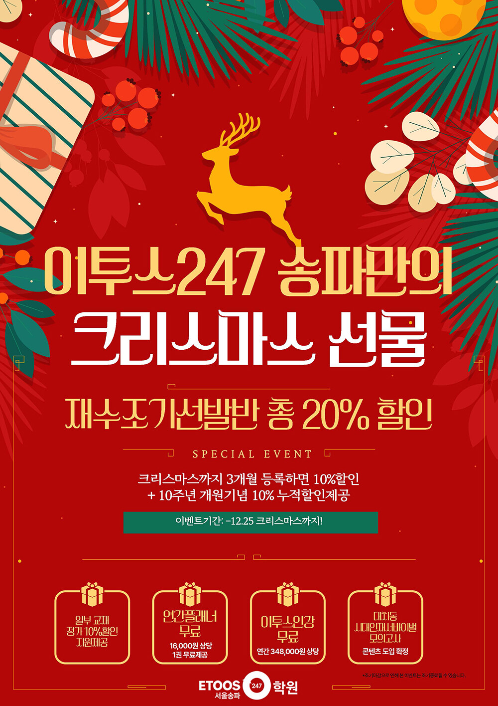 이투스247학원 송파점, 2026 N수 조기 선발반 12월 30일 개강…창립 10주년 기념 및 크리스마스 20% 할인 혜택 제공