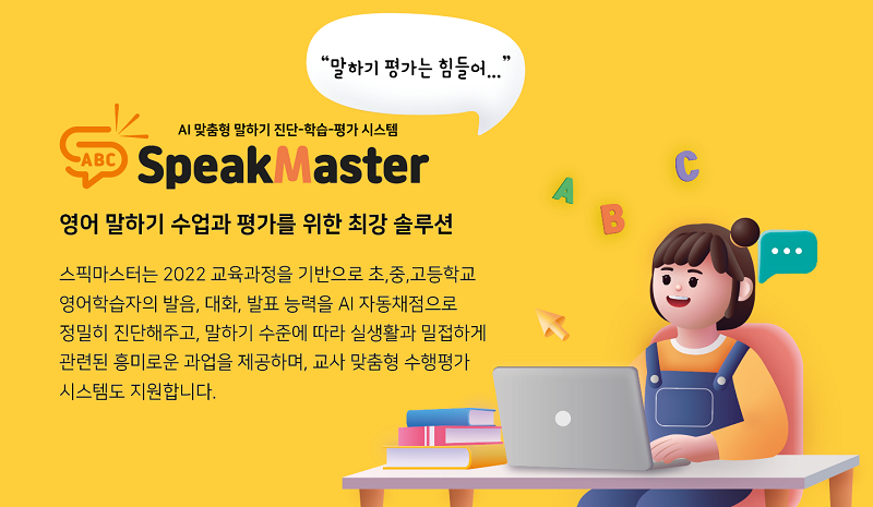 ‘스픽마스터’는 한국연구재단 지원으로 연구·개발된 학습자 맞춤형 말하기 진단, 학습, 평가 시스템이다. AI 말하기 자동 채점을 구현한 초·중·고 학습자용 스피킹 레벨 테스트, 교사용 말하기 수행평가 도구, 등급별 음성 챗봇 기반 수업 활동 등 다양한 기능을 갖춘 AI 기반 말하기 교육용 플랫폼으로, 2022 교육과정에 맞춰 설계되어 학교 수업에서 활용하기에 적합하다.