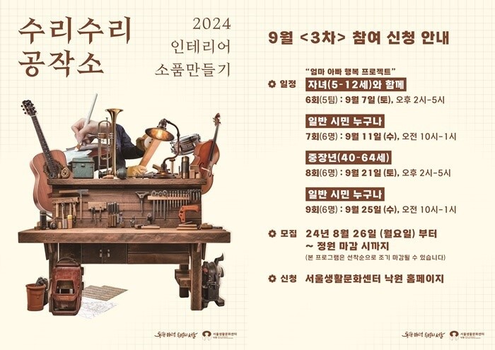 [피앤피뉴스=이수진 기자] 서울생활문화센터 낙원에서는 지난 7월과 8월에 이어 폐악기를 활용한 인테리어 소품 제작 만들기 프로그램 '수리수리 공작소' 3차 프로그램을 9월 순차 진행할 예정이다.