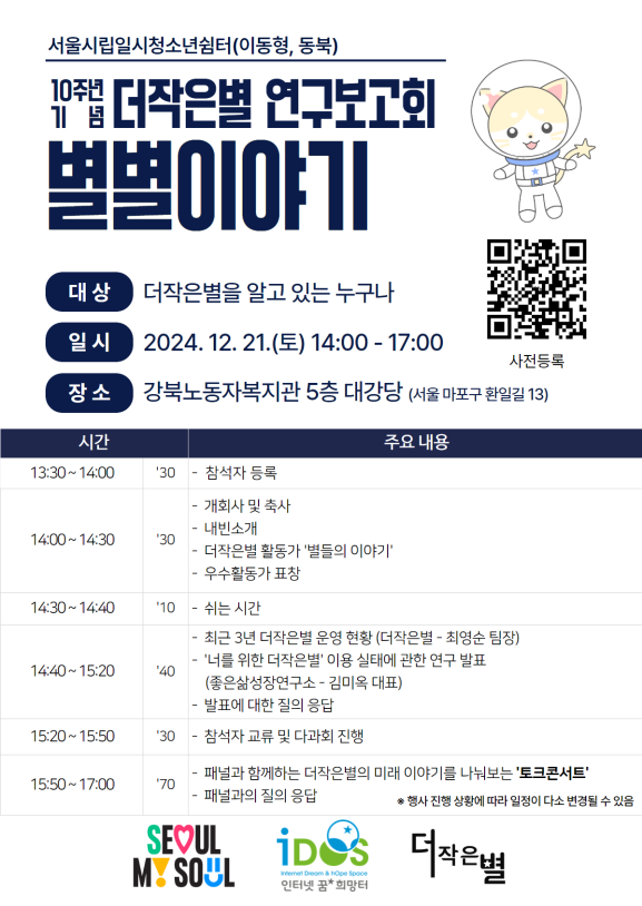 연구보고회 ‘별별이야기’에 대한 자세한 정보는 더작은별 공식 홈페이지(b612.or.kr)와 인스타그램(@b6121318)에서 확인할 수 있다. 포스터 하단의 QR코드를 통해 사전 등록을 하면 행사 관련 안내를 받을 수 있다.