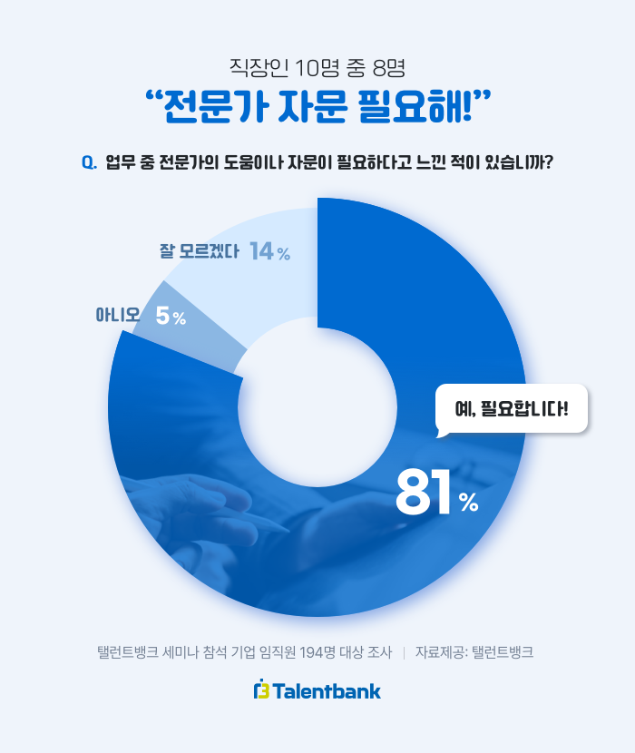 [피앤피뉴스=마성배 기자] 직장인 10명 중 8명이 업무 중 전문가 자문의 필요성을 느끼는 것으로 조사됐다. 전문가 네트워크 플랫폼 탤런트뱅크는 최근 세미나에 참석한 기업 임직원 194명을 대상으로 설문을 실시한 결과, 81.4%가 업무 중 전문가의 도움이나 자문이 필요하다고 응답했다고 28일 밝혔다.