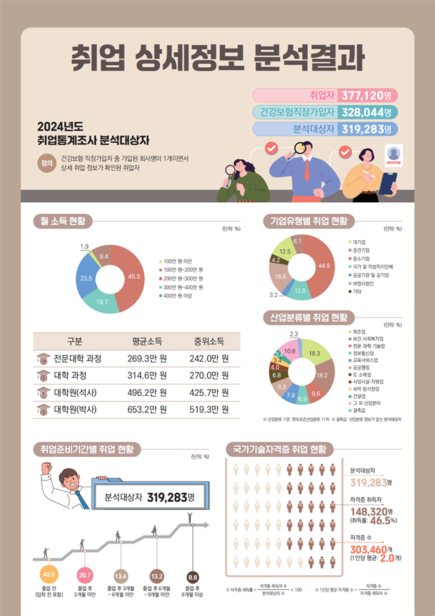 건강보험 직장가입자를 대상으로 한 취업 상세 정보에서는 졸업자의 월 평균소득이 342만 6천 원으로 집계됐다. 전문대 졸업자는 269만 3천 원, 일반대 314만 6천 원, 석사 496만 2천 원, 박사 653만 2천 원으로 전년 대비 모두 상승했다. 취업 준비기간은 졸업 전 이미 취업한 비중이 43.9%로 가장 높았고, 졸업 후 3개월 이내 취업자가 20.7%로 뒤를 이었다. 산업별로는 제조업과 보건·사회복지업이 각각 18%대를 차지하며 가장 큰 비중을 보였고, 기업 유형별로는 중소기업이 44.9%로 절반에 육박했다.