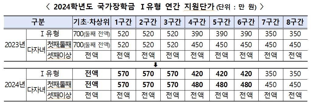 학자금 지원 1~3구간은 전년대비 지원금을 50만원, 4~6구간은 30만원을 인상했고, 7~8구간은 350만원을 지원한다. 8구간 이하 셋째 이상 대학생은 등록금 전액을 지원받는다.