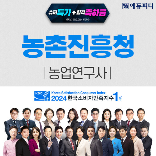 한편, 농촌진흥청 농업연구사 임용 시험 수험 강좌를 지속적으로 운영해온 에듀피디가 2025 농촌진흥청 연구직 공무원 경채 시험에 맞춰진 ‘합격패키지’ 인강을 선발 직류별로 기획해 수험생들이 짧은 수험 기간 동안 효율적인 학습으로 고득점 획득을 빠르게 달성할 수 있도록 돕는다.