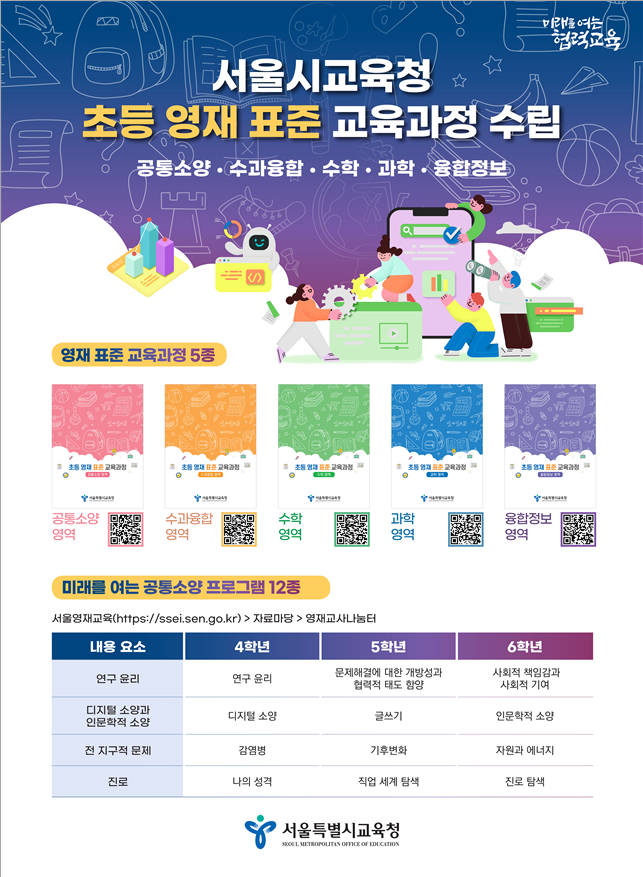 서울시교육청은 영재교육기관별로 교육 내용에 편차가 크고, 초·중·고 간 연계가 부족하다는 지적을 해결하기 위해 전국 최초로 ‘초등 영재 표준 교육과정’을 수립했다. 이는 수학, 과학, 융합정보 등 분야별로 구성되어 있으며, 기관별 강사 재량에 따라 달라졌던 기존 커리큘럼을 체계화한 것이다.