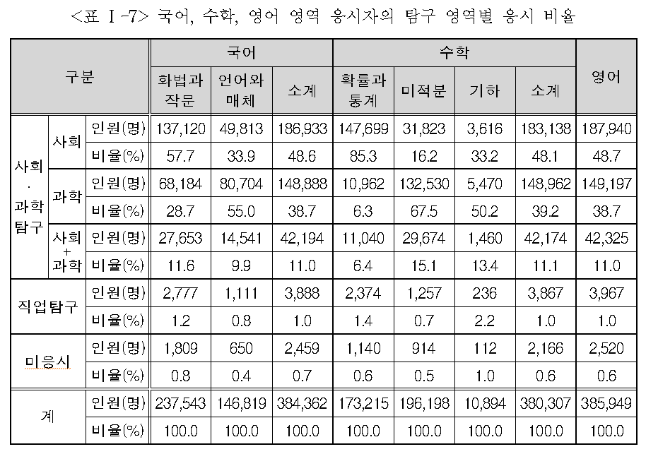 탐구 영역에서는 사회·과학탐구 응시자가 99%를 차지했고, 직업탐구 응시자는 1%에 불과했다. 사회·과학탐구 영역에서는 응시자 중 99.4%가 최대 선택 과목 수인 2개 과목에 응시해 다수의 수험생이 다양한 과목을 선택한 것으로 분석됐다.